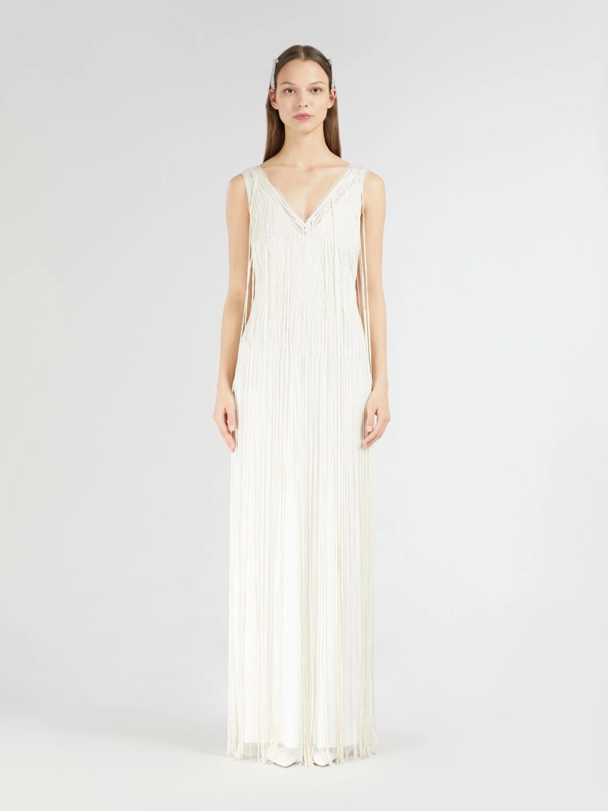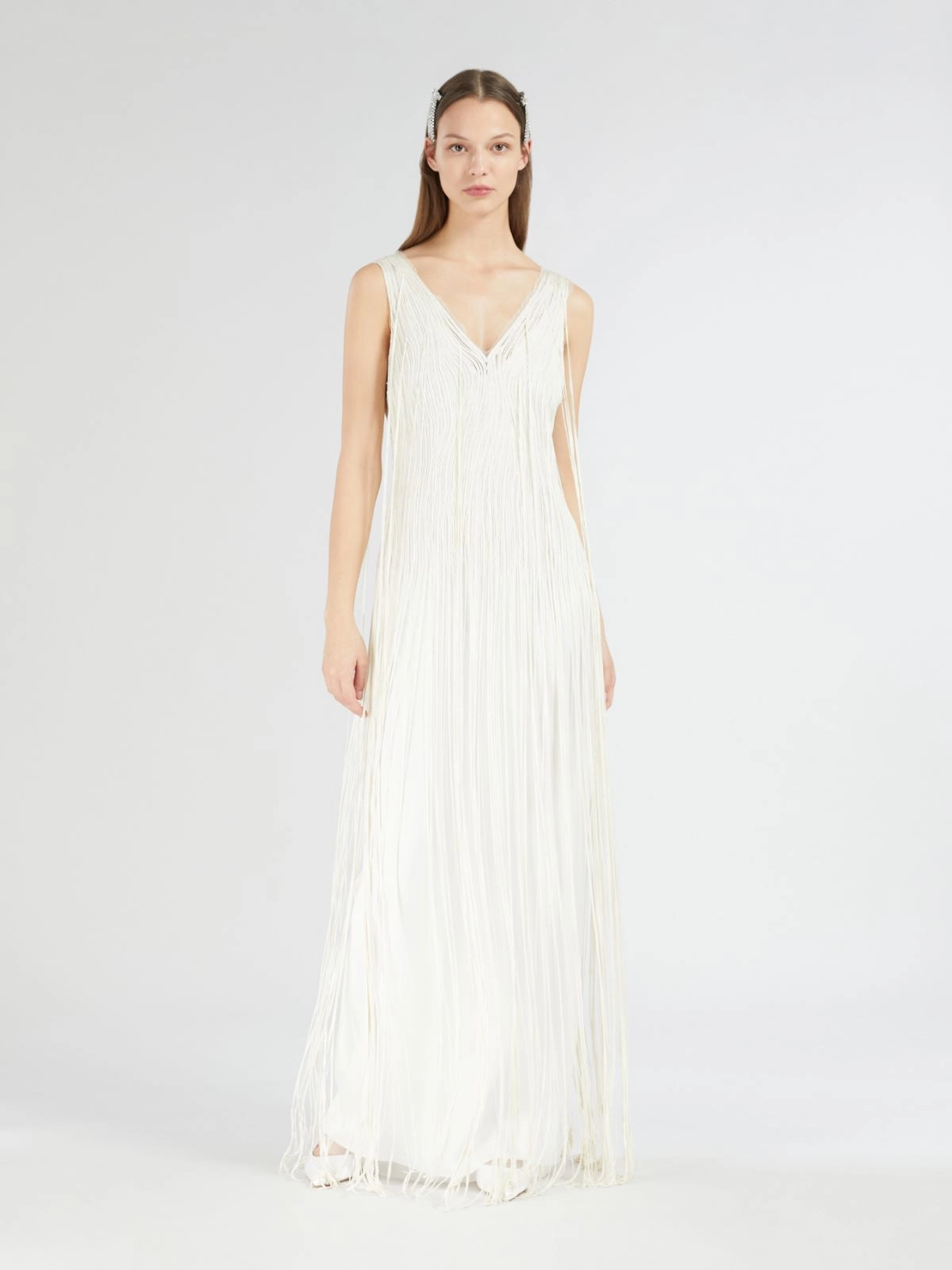 Long sleeveless dress with dramatic long fringes, stitched down to the hip for a textured effect and then left free.