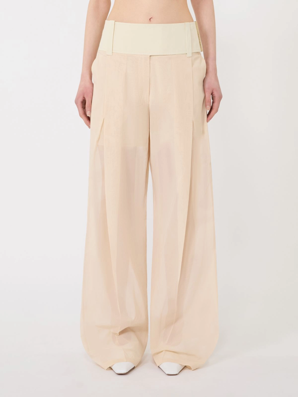 Trousers in organza-feel pure cotton voile fabric featuring a high-waist belt that fastens by means of the concealed buttons at the side. The deep pleat enhances the leg volume before the cut tapers slightly at the hem.