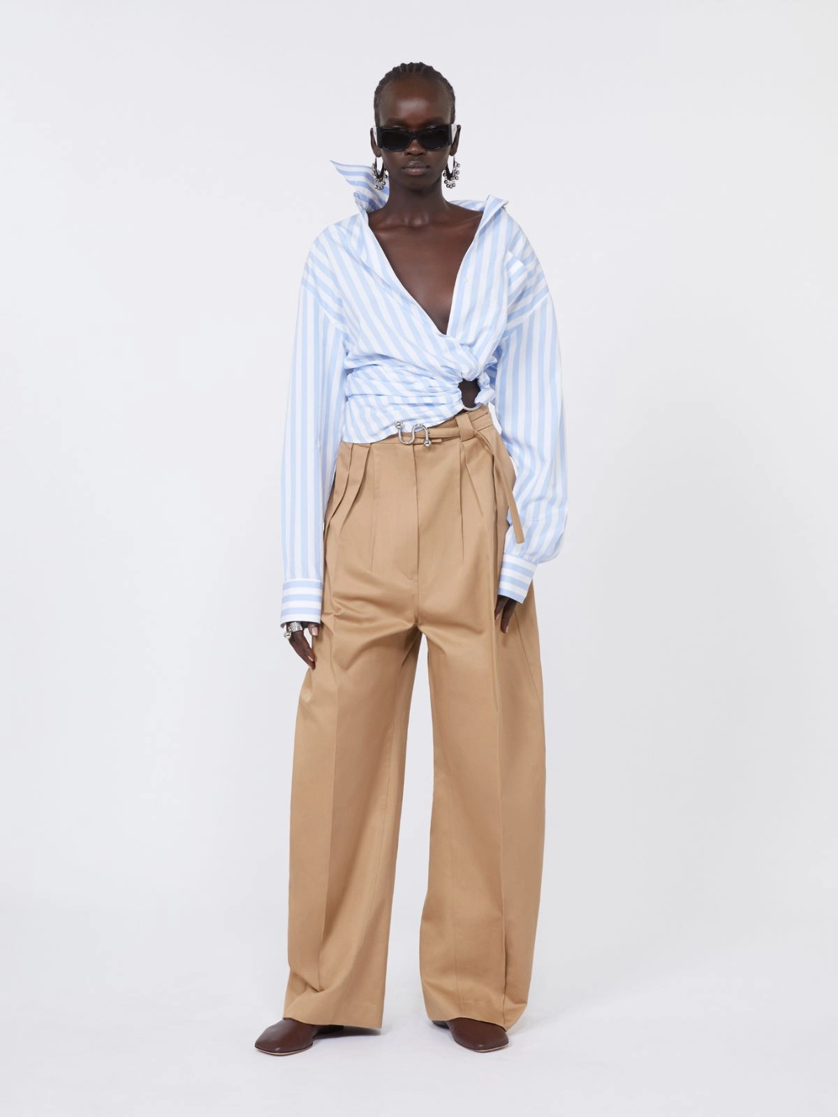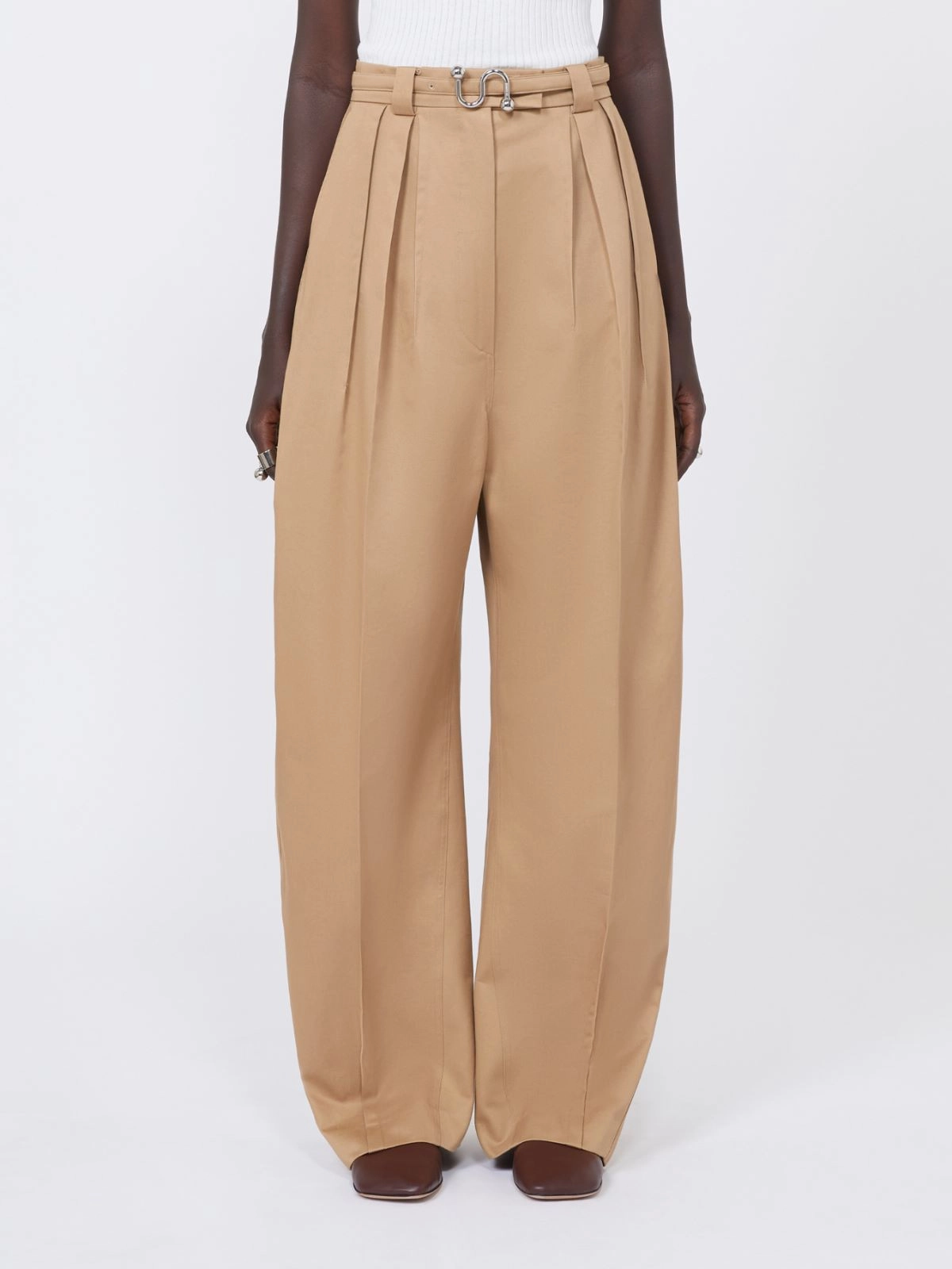 Cotton gabardine trousers with a fitted waist defined by a belt and double pleats, with legs that widen to an oversized volume that tapers at the hem through shaped seams and darts at the ankle. The continuous inner waistband and pockets are mannish tailored model-inspired details.